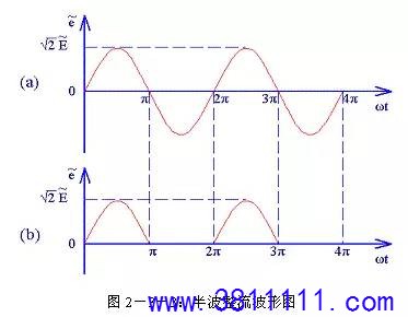 基础电路 一般直流稳压电源都使用220伏市电作为电源,经过变压、整流、滤波后输送给稳压电路进行稳压,最终成为稳定的直流电源。这个过程中的变压、整流、滤波等电路可以看作直流稳压电源的基础电路,没有这些电路对市电的前期处理,稳压电路将无法正常工作。 变压电路 通常直流稳压电源使用电源变压器来改变输入到后级电路的电压。电源变压器由初级绕组、次级绕组和铁芯组成。初级绕组用来输入电源交流电压,次级绕组输出所需要的交流电压。通俗的说,电源变压器是一种电→磁→电转换器件。即初级的交流电转化成铁芯的闭合交变磁场,磁场的磁力线切割次级线圈产生交变电动势。次级接上负载时,电路闭合,次级电路有交变电流通过。变压器的电路图符号见图2-3-1。 整流电路 经过变压器变压后的仍然是交流电,需要转换为直流电才能提供给后级电路,这个转换电路就是整流电路。在直流稳压电源中利用二极管的单项导电特性,将方向变化的交流电整流为直流电。 (1)半波整流电路 半波整流电路见图2-3-2。其中B1是电源变压器,D1是整流二极管,R1是负载。B1次级是一个方向和大小随时间变化的正弦波电压,波形如图 2-3-3(a)所示。0~π期间是这个电压的正半周,这时B1次级上端为正下端为负,二极管D1正向导通,电源电压加到负载R1上,负载R1中有电流通过;π~2π期间是这个电压的负半周,这时B1次级上端为负下端为正,二极管D1反向截止,没有电压加到负载R1上,负载R1中没有电流通过。在 2π~3π、3π~4π等后续周期中重复上述过程,这样电源负半周的波形被“削”掉,得到一个单一方向的电压,波形如图2-3-3(b)所示。由于这样得到的电压波形大小还是随时间变化,我们称其为脉动直流。 设B1次级电压为E,理想状态下负载R1两端的电压可用下面的公式求出: