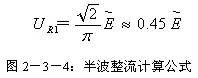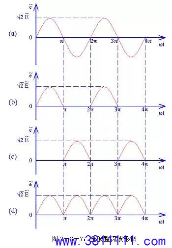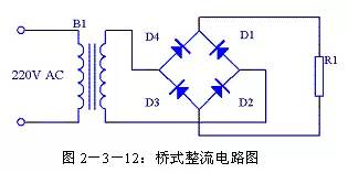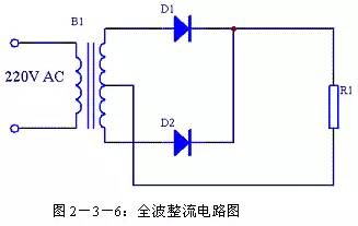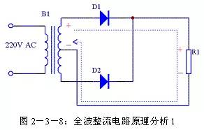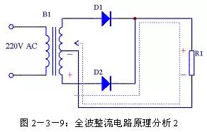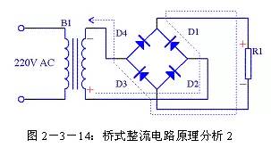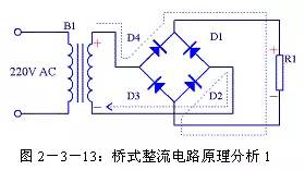 (2)全波整流电路 由于半波整流电路的效率较低,于是人们很自然的想到将电源的负半周也利用起来,这样就有了全波整流电路。全波整流电路图见图2-3-6。相对半波整流电路,全波整流电路多用了一个整流二极管D2,变压器B1的次级也增加了一个中心抽头。这个电路实质上是将两个半波整流电路组合到一起。在0~π期间B1次级上端为正下端为负,D1正向导通,电源电压加到R1上,R1两端的电压上端为正下端为负,其波形如图2-3-7(b)所示,其电流流向如图2-3-8所示;在π~2π期间B1次级上端为负下端为正,D2正向导通,电源电压加到R1上,R1两端的电压还是上端为正下端为负,其波形如图2-3-7(c)所示,其电流流向如图2-3-9所示。在2π~3π、3π~4π等后续周期中重复上述过程,这样电源正负两个半周的电压经过D1、D2整流后分别加到R1两端,R1上得到的电压总是上正下负,其波形如图2-3-7(d)所示。 设B1次级电压为E,理想状态下负载R1两端的电压可用下面的公式求出: 整流二极管D1和D2承受的反向峰值电压为: 全波整流电路每个整流二极管上流过的电流只是负载电流的一半,比半波整流小一倍。 (3)桥式整流电路 由于全波整流电路需要特制的变压器,制作起来比较麻烦,于是出现了一种桥式整流电路。这种整流电路使用普通的变压器,但是比全波整流多用了两个整流二极管。由于四个整流二极管连接成电桥形式,所以称这种整流电路为桥式整流电路。 由图2-3-13可以看出在电源正半周时,B1次级上端为正,下端为负,整流二极管D4和D2导通,电流由变压器B1次级上端经过D4、R1、D2回到变压器B1次级下端;由图2-3-14可以看出在电源负半周时,B1次级下端为正,上端为负,整流二极管D1和D3导通,电流由变压器B1次级下端经过 D1、R1、D3回到变压器B1次级上端。R1两端的电压始终是上正下负,其波形与全波整流时一致。 设B1次级电压为E,理想状态下负载R1两端的电压可用下面的公式求出: |