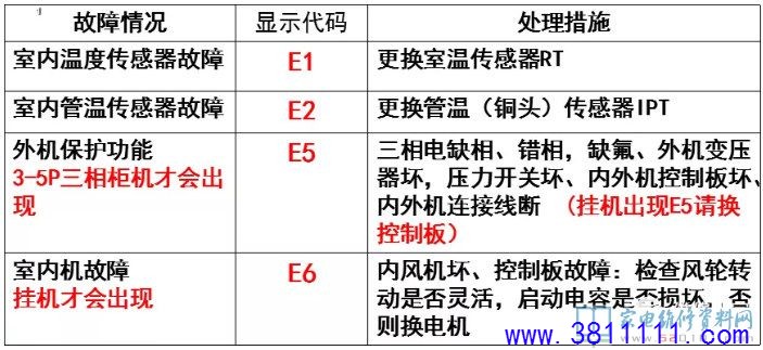 机型不同显示的故障代码可能有所不同,见下表,显示E5时观察外机板上绿色指示灯是否亮,绿灯亮表示电源及控制板正常,P2应有220V输出,不亮请检查三相电是否缺相错相、变压器是否正常。否则更换外机板。绿灯亮仍显示E5,请检查压力开关、压缩机温度控制器、室内外连线是否导通,内机P7是否有220V,如P7有220V仍显示E5,则为内机板坏。