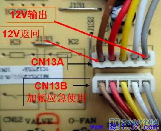 检修时万用表置直流档,黑笔搭内机控制板7812的铝散热片,红笔分别测量CN13A的灰色和棕色线,如果灰色线无12V则为内机板故障,如果棕色线无12V则为外机控制板故障,如有棕色线12V则为内机板故障。必要时试着短接灰色和棕色线,看E5是否消失、外机是否运行。