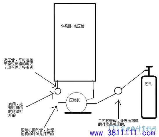 拿掉干燥过滤器,高压管这边焊接表阀并打开,接下来拿掉回气管,工艺管焊接表阀并关闭,连接氮气(没有氮气用R22代替)。启动压机,空气会从压机回气管进入,最后在焊接好表阀的高压管排出,这个时候就可以去干其他活了,让压机自己运行2个小时以上,靠它自身的热量,把内部水分全部蒸发排除掉。