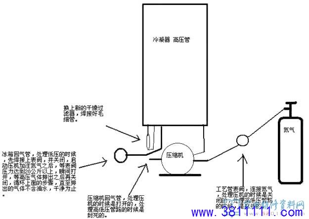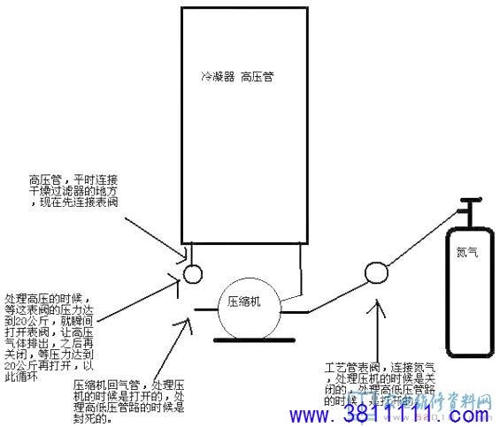 先关闭压机,把压机的回气管封死,启动压机,打开工艺管表阀,慢慢加注氮气,关闭冰箱高压管上面的表阀,等这个表阀的压力达到20公斤以上,瞬间打开表阀,让高压管内的高压氮气瞬间排出,这时如果高压管内有水分的话,会被快速排出的气体给带出来,之后再关闭表阀,等压力达到20公斤以上再打开,如果循环5次以上,直到你感觉高压管被处理干净为止。