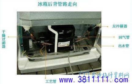 结果发现了制冷差的问题和无制冷剂的原因,为高压右冷凝器部分有泄漏点,可以确定并解决的问题,右侧板无法扒开查找漏点,只能去除右冷凝器了。我们把冰箱的后背板小心的扒开,尽量不破坏,取下后用铜管重新在后背板上盘管,与背板固定好后,重新扣回原位,管路与左冷凝器接好后与压缩机连接焊好,打压检测各焊口有无漏点,确认无误后,抽空,充入制冷剂,试机后正常,送回用户家继续使用,至今使用良好。