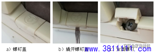 图2 外壳紧固螺钉安装位置 2.拆卸壳体紧固螺钉。使用一字螺丝刀撬开螺钉盖,露出壳体紧固螺丝如图3所示。