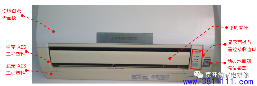 拆解三菱电机MSZ-ZC09VC高端全直流变频分体空调内机 张湘粤 该款内机,如图1所示,采用珍珠白工艺的豪华面板,长时间使用不会变色。中壳、底壳和出风百叶等使用ABS工程塑料,时间长会有逐渐变黄迹象。右下角是信号接收、指示灯窗口以及安设了动态地面测温的传感器。机子采用顶部珊格回风形式。