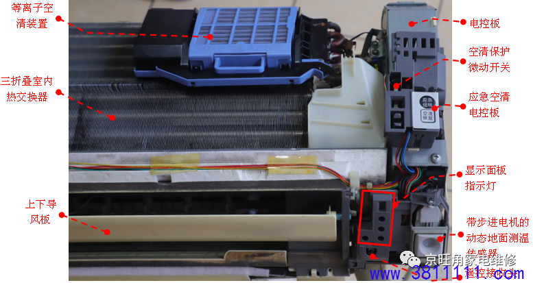 图3(a-c) 壳体紧固螺钉拆卸流程 3.内机结构。取下上盖(面板)后内机的结构,如图4所示。 图4 内机内部器件布置结构图