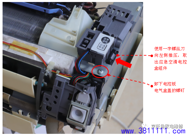 5.空清电控板和电控盒盖拆卸。拆卸应急空清电控板和电控金属盒盖螺钉,便于取出整套电控板,如图6所示。