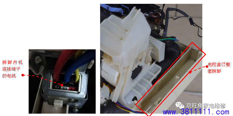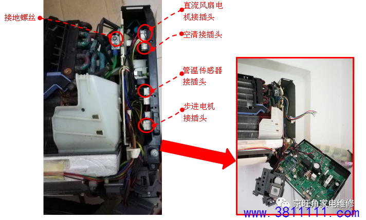图8 内机电气连接端子、线路 图9 已拆卸电控盒后内机图片