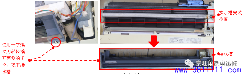 7.接水槽拆卸。使用一字螺丝刀轻轻撬开两侧的塑料锁扣,往下侧均匀用力拉出接水槽,如图10所示。 图10 拆卸接水槽