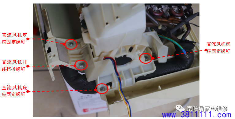 图11 拆卸贯流风扇与直流风机连接螺钉 9.拆卸直流风机底座固定螺钉,如图12所示。