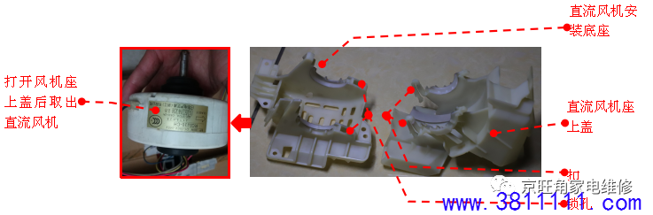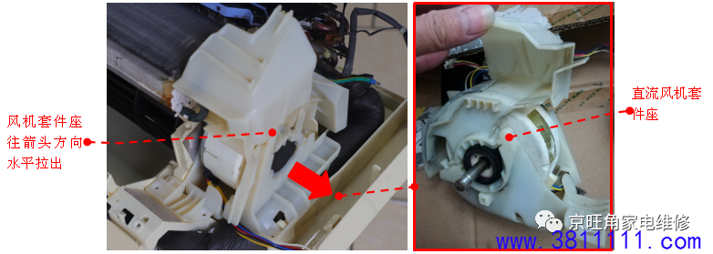 图12 拆卸固定直流风机底座的螺钉 10.拆卸直流风机固定座套件,如图13所示。用力往机子的右侧水平拉动直流风机套件座,如果遇到拆卸困难,一般就是风机轴与扇叶孔连接处锈蚀或卡死,可以采取在连接轴处喷少许除锈剂后再进行拆卸,这样确保能顺利移出。