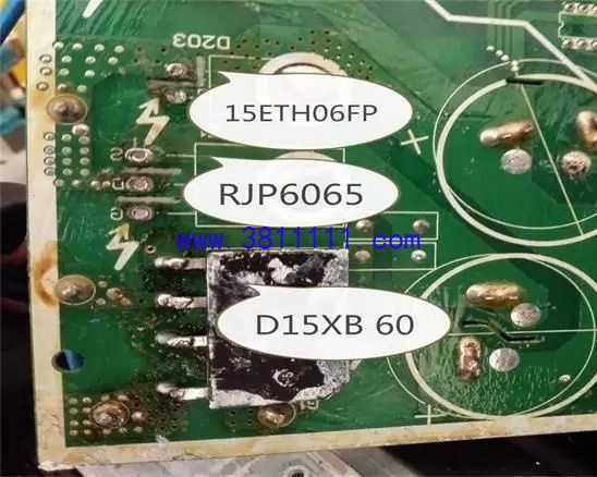 格力空调开机显示E6 开机显示E6(E6为通讯故障,不多说)拆开内机接线盒,表测N线对通讯线无电压(正常工作时有30V左右的交流电压,在这儿多说两句,有些空调的通讯电压由内机形成,这时可以拔掉到外机的通讯线,开机可以测到电压则是外机板或者线本身有问题,特别是加长了线的,接头当时没处理好,容易出事,如果测不到电压就是内机板问题! 有些机型是由外机形成通讯电压的为了准确最好拆开外机测试,本机就是由外机形成) 翻窗,拆开外机测试,供电正常无通讯电压,确定是外机板问题,于是拆板回家,当然内机板也得拆回! 所有板件放置工作台,接好PG电机(不接的话开机一会儿就H5,在这里不要问我为什么,以后单独谈处理H5故障)变压器,所有内外机传感器,连接线,通电开机观察外机板上指示灯一个都不亮,(不亮是无电,一个或者多个常亮是CPU没工作)测大电容无电压,按线路查,保险,PTC正常, 卸下板和散热器的螺丝从电器盒里拿出板子,测桥堆,挂了!测场管,挂了!测二极管,挂了!测IGBT.......还好!其它地方没发现有问题!有戏! 问题找到了,配件呢?找淘宝,有货! 为了验证判断是否正确,桥堆直接用电磁炉的2510,二极管和场管在长虹等离子电视电源部份找(PFC电路)压缩机用三个200W灯泡接成星形代替,一切检查无误,通电开机,E6不再有,灯泡闪亮一下就暗下去,(模拟压缩机启动)一会儿灯泡渐渐变亮(升频)用遥控器把温度调高到接近室温,灯泡变暗(降频)!至此故障明确,修理基本成功 |