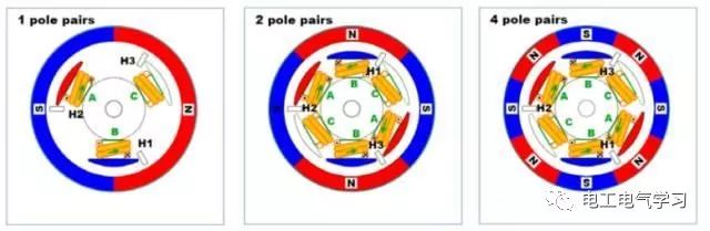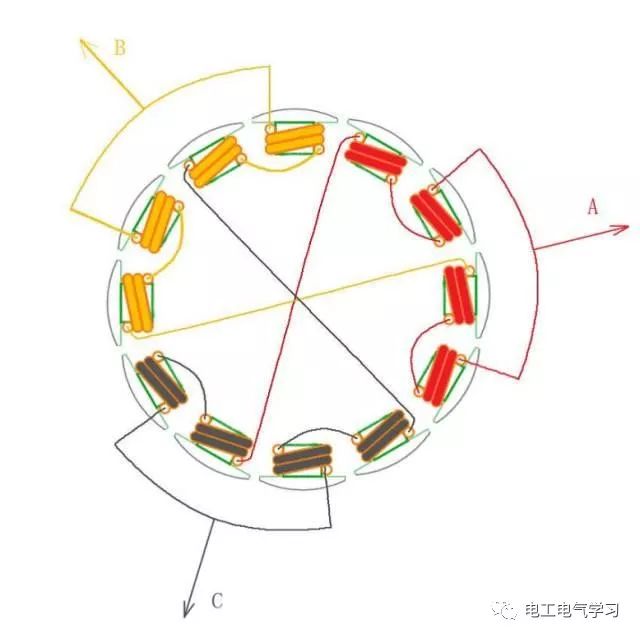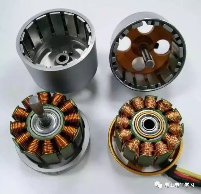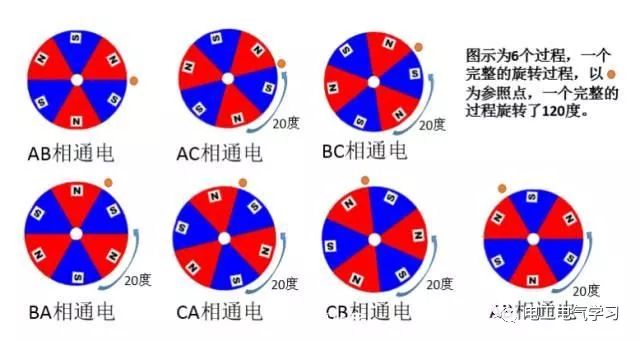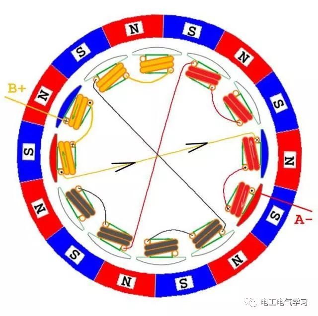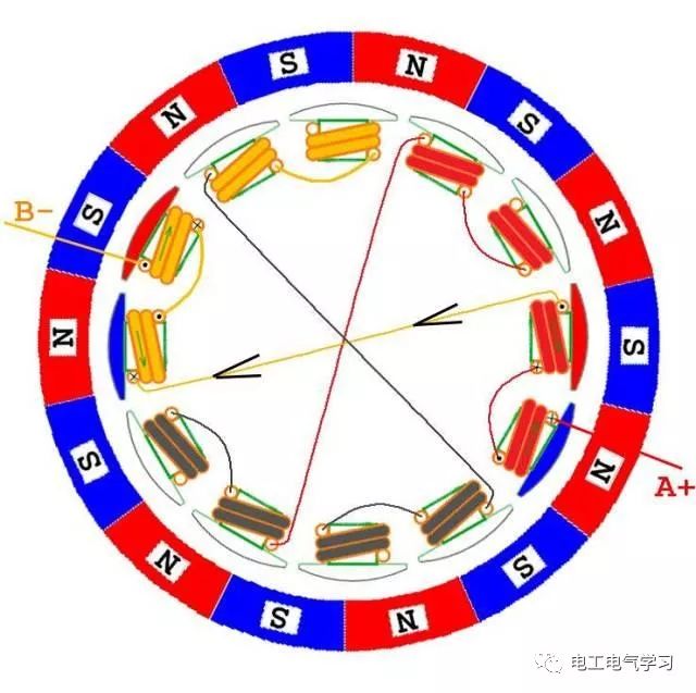第五阶段:CA通电 第六阶段:CB通电 以上为六个不同的通电状态,其中经历了五个转动过程。每个过程为20度。 第四部分:外转子无刷直流电机 看完了内转子无刷直流电机的结构,我们来看外转子的。其区别就在于,外转子电机将原来处于中心位置的磁钢做成一片片,贴到了外壳上,电机运行时,是整个外壳在转,而中间的线圈定子不动。外转子无刷直流电机较内转子来说,转子的转动惯量要大很多(因为转子的主要质量都集中在外壳上),所以转速较内转子电机要慢,通常KV值在几百到几千之间。也是航模主要运用的无刷电机。 顺便啰嗦一下吧。无刷电机KV值定义为:转速/V,意思为输入电压每增加1伏特,无刷电机空转转速增加的转速值。比如说,标称值为1000KV的外转子无刷电机,在11伏的电压条件下,最大空载转速即为:11000rpm(rpm的含义是:转/分钟)。 同系列同外形尺寸的无刷电机,根据绕线匝数的多少,会表现出不同的KV特性。绕线匝数多的,KV值低,最高输出电流小,扭力大;绕线匝数少的,KV值高,最高输出电流大,扭力小。我先前测试过穿越机2204电机的极限电流,单电机能彪上25A,而2212系列电机15A都上不了。 外转子无刷直流电机的结构 分析方法也和内转子电机类似,大家可以自己分析一下,根据右手螺旋定理判断线圈的N/S极,转子永磁体的N极与定子绕组的S极有对齐(吸引)的趋势,转子永磁体的S极与定子绕组的N极有对齐(吸引)的趋势,从而驱动电机转动。 经典无刷电机2212 1000kv电机结构分析。 图为DJI 2312S电机和XXD 2212电机的(解剖图) 其结构如下:定子绕组固定在底座上,转轴和外壳固定在一起形成转子,插入定子中间的轴承。 图为xxd2212线圈拆解图 图为12绕组14极(即7对极),电机绕组绕发图 后面画出了6种两相通电的情形,可以看出,尽管绕组和磁极的数量可以有许多种变化,但从电调控制的角度看,其通电次序其实是相同的,也就是说,不管外转子还是内转子电机,都遵循AB->AC->BC->BA->CA->CB的顺序进行通电换相。当然,如果你想让电机反转的话,电子方法是按倒过来的次序通电;物理方法直接对调任意两根线,假设A和B对调,那么顺序就是BA->BC->AC->AB->CB->CA,大家有没有发现这里顺序就完全倒过来了。 AB相通电 AC相通电 BC相通电 BA相通电 CA相通电 CB相通电 要说明一下的是,由于每根引出线同时接入两个绕组,所以电流是分两路走的。这里为使问题尽量简单化,下面几个图中只画出了主要一路的电流方向,还有一路电流未画出,另一路电流的具体情况放在后面进行分析,涉及到电路检测换相位置 |