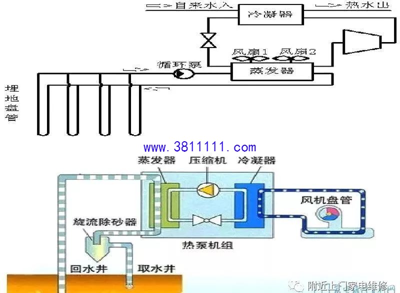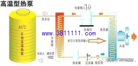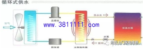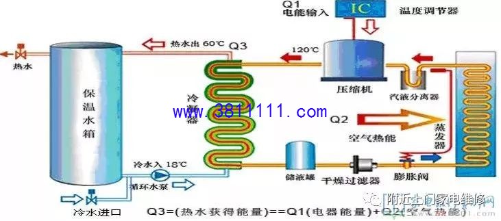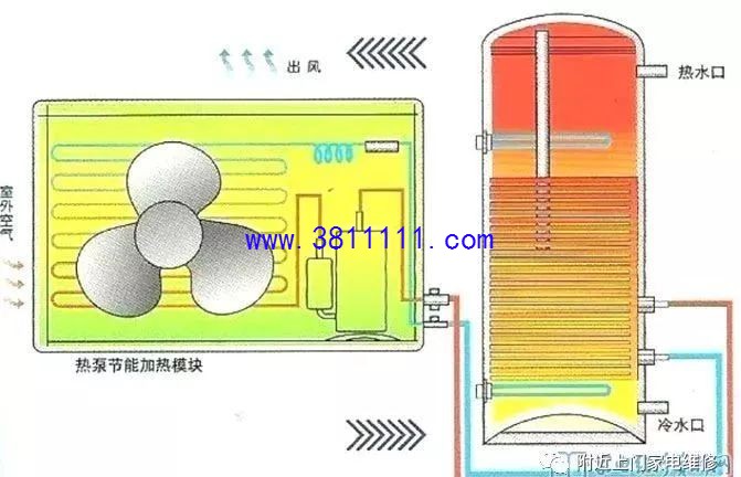 前言:空气能热水器属于外来技术,追溯起源的话,1824年热泵的理论起源于卡诺发表的关于卡诺循环的论文,1850年初开尔文提出冷冻装置可以用于加热,之后许多科学家及工程师对热泵进行了长达80年的大量研究,到了1924年,空气源热泵技术发明,但是并未被人们充分认识和应用;随着社会节能环保的意识提高,以及技术的不断发展,空气能目前已经得到了广泛的应用,目前部分新地区的商品房也把空气能热水器作为标配。本文接下来讲详细的讲解关于空气能热水器的工作原理以及相关的知识。 一、空气源热泵热水器基础知识 1、名称解释 空气源--热能来源于空气中;另外还有 水源、地源等。 空气能--空气不是一种能量,能量的形式有 电能、热能、太阳能、风能、动能、等等 热泵--一种利用高位能使热量从低位热源流向高位热源的装置 2、几种常见的名称叫法 国内目前最常见的几种叫法:空气源热水器、空气源热泵热水器、空气能热水器、空气能热泵热水器、热泵热水器,其中最精确的叫法应是“空气源热泵热器”。 国内的一些行业协会为了统一称呼,利于这种热水器在国内的推广,统一称为空气能热水器,这个叫法虽不太准确,但比较直观,易于让消费者理解。 3、发展历史 1824年,热泵的理论起源于卡诺发表的关于卡诺循环的论文; 1850年初开尔文提出冷冻装置可以用于加热;之后许多科学家及工程师对热泵进行了长达80年的大量研究。 1924年,空气源热泵技术发明,但并未被人们充分认识和应用; 20世纪60年代,世界能源危机爆发,热泵以其回收低温废热,节约能源的特点,经过改进而登上历史舞台受到人们的青睐。比如美国,热泵的产量从1971年的8.2万套/年增至1976年的30万套/年,1977年再次增加为50万套/年,而此时,日本后来居上,年产量超过50万套。 在欧美大多数发达国家,如澳大利亚、英国、法国、德国、北欧南欧等国家,热泵产品已经进入了大多数家庭。1998年美国的调查数据显示,美国约有30%的热水供应设备采用空气能热水机组,到从2001年开始美国每年安装40万台空气能热水器,并保持每年10%的速度递增。 2000年我国开始尝试热泵在热水设备上应用; 2002年前后空气能热水器引进中国登陆广东; 2003年我国广东出现一批专业生产空气能热泵热水器的制造商和销售商。 二、空气源热泵热水器原理 热泵技术是基于逆卡诺循环原理实现的。主要由:压缩机、冷凝器、膨胀阀和蒸发器四个部分组成,工作过程如下: