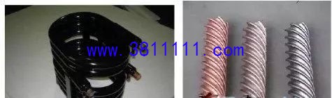 3.水水冷凝器 (1)螺旋套管式换热器 大直径的不锈钢无缝钢管内套一根螺旋铜管,两者紧密的配合在一块,铜管里面走冷却水,铜管和钢管之间的螺纹空隙走制冷剂.水与R22逆向流动. 优点:制造简单,换热效率高,而且价格便宜。水在铜管中紊流状态,不易结水垢,防冻能力强,不易堵塞,对水质要求低,性价比高。 缺点:体积较大,不能适用于大功率的机组。
