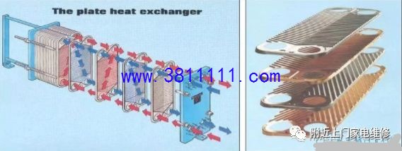 (2)板式换热器 由316超低碳不锈钢板片压制,真空焊接而成.水和制冷剂在薄片中间隔流动,接触充分,换热效率高.适用于功率较大的机组 。 优点:结构紧凑,体积小,冷却水量小,换热效率高,具有很强的耐腐蚀能力, 缺点:价格较贵,防冻能力差,对水质要求高,容易堵塞。