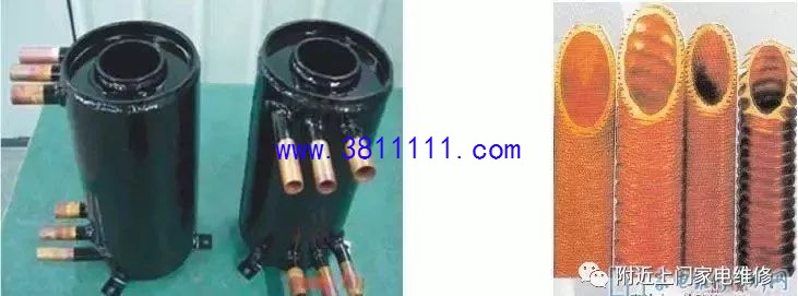 (3)壳管式换热器 盘管采用高效翅片管,换热面积是光管的3.7倍,盘管紧凑的螺旋结构保证冷媒能充分换热,水路流速均匀。换热效率高,体积小,不容易堵塞,可以使用于任何机组。