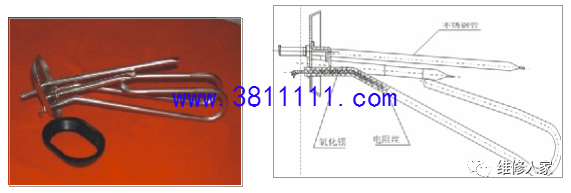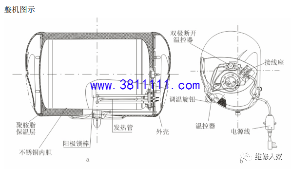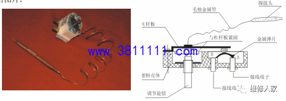 一、元器件功能配图 1、漏电保护插头 功能:当电热水器有漏电或电流过大时,漏电保护插头线即时断开电源起到保护人身 安全和电热水器的作用。(如图示) 说明:在接地可靠的情况下,漏电保护器是靠检测(由比较器检测)流过电源线火线与零线的电流是否一样来判断漏电与否,若比较器达到漏电动作范围,继电器动作实 现保护,如未达到动作漏电电流,则不动作。保护器电路中还设有一个试验装置来试验保护器是否正常。当按此键时,便产生一 个模拟动作电流,继电器便动作,切断电源。说明:漏电保护器分三极断和二极断,三极断就是在发生漏电时将火线,零线、地线切断,而二极断则只将火线、零线切断。 2、控温器 功能:控制及调节热水温度,最高温度设定为:75℃,分为可调和定温两种。 说明:控温器是一端由装有液态材料的探温头(探温头套在发热管一盲孔内)和另一 端同调温旋钮装在一起的触点开关组成,中间由毛细金属管连接,液态可以管内自由流动,液态材料受热膨胀,受冷收缩,膨胀,收缩量随温度变化而变化。调定温度开始加热时(温度必须调至大于内胆的初始水温,否则不会加热),温控器是如上图所示常闭,当内胆的温度达到设定值时,液态受热膨胀流过毛细管顶起杠 杆板,金属片自然弹起,断开两极,停止加热。当水温下降到设定温度的 5℃左右时,液态冷缩,杠杆板自动回弹并压下弹簧片至 A 点,电路重新闭合,开始加热,实现保 温功能。 3、单极热断路器 功能:当热水温度加热到设定值时自动跳闸断开电源,起到过热保护作用,最高温度设定为 90℃,主要用 J2 系列的产品。 4、双极超温器 功能:与热断路器一样,最高温度设定为 88,主要用在 J1 及 D1 及其他系列的产品。 说明:当内胆水温达到 88 时,金属片受热变形向上弹,顶起绝缘顶杆,断开两极实现 防超温保护。当双极断开需复位时,必须手动按下手动复位键,并用万用表测量两极 是否相通。 5、电热管 功能:电能→热能转化装置,用来对水进行加热,功率有 1500W~3000W,主要用的是 1500W。 6、混水阀 功能:用来将热水和冷水混合,以达到所需的水温。 7、安全阀 功能:用来保护内胆,减少内胆的承受压力,当内胆内的压力或自来水进水的压力大 于额定压力(一般为 0.6MPa,部份为 0.7MPa)时,安全阀会自动泄压,以起到保护内胆的作用。 二、元器件的原理及检测方法 1、控温器原理: 现用控温器均为液体膨胀式结构。利用液体有热胀冷缩的特性,控温器将特殊液体密封在探管和毛细管组成的密封腔中,探管插到待测温部位,当该处温度上升时探管内液体膨胀,并沿毛细管移动至末端,膨胀的液体使膜盒变型后推动触点,使电路断开,停止加热。调节控温器旋钮,也就是调节将触点断开的位移量,而此 位移量与感测的温度成特定比例。当温度下降后,膨胀后的液体会逐渐缩小体积, 触点又回复到导通状态,发热管重新开始加热,这就是控温器控制水温的原理。检测方法:量通断:拆下连接线,万用表打到电阻×10 档,调零后,用表笔测两端子应为 导通,否则判为损坏,需更换(可调式控温器要把旋钮转到最高温位置测量)。用表笔测量两端子与金属外壳应为不导能,否则判定为损坏,需更换。 2、超温保护器(热断路器)原理: 利用金属片热变形原理,当金属片感测到变形温度时,双金属片产生整体变 形,推动顶杆运动使接触点断开,从而切断加热电源,从而达到超高温保护的目的。检测方法:拆下连接线,万用表打到电阻×10 档调零后,用表笔测量两端子,常态为导通,否则为损坏,需更换,用表笔测量端子与金属外壳应为不导通,否则为损坏,需更 换。 3、电热管原理: 电能→热能转化装置,利用电热管能发热的功能特点将水加热。 检测方法: ①万用表在打在电阻×10 档,量两端子间电阻,正常时在标准误差范 围之内(307Ω~358Ω以 1500W 为例),无穷大为电热管灯断开路,需更换,太小为电热管老化,功率降低,需更换。 ②万用表在打在电阻×10 档(或 2MΩ档), 红表笔接端子,黑表笔接安装盘,测得阻值应大于 2MΩ,否则判为绝缘坏,需更 换,以防漏电。 4、漏电保护插头开关原理: 利用漏电开关内部装置,当电热水器有漏电或负载电流大过额定电流时会自动跳闸,切断电源,避免事故发生。检测方法:通电后按试验按钮,漏电开关应立即跳闸。复位后拨下插头,万用表打在电阻×维修手册10 档,红表笔接插头一端子,黑表笔接连线端子,插头端子与连线末端端子应一 一对应导通(L、N、G);四线的漏电保护插头通电后用蓝色接线端与超温信号线 端相接触,漏电开关应立即跳动闸,按下复位键电源指示灯应为亮着。漏电保护插头线全部从热水器上拆下后复位,万用表打在×10K 档(或 2MΩ档),任意两插头端子间阻值在于 7MΩ以上。 |