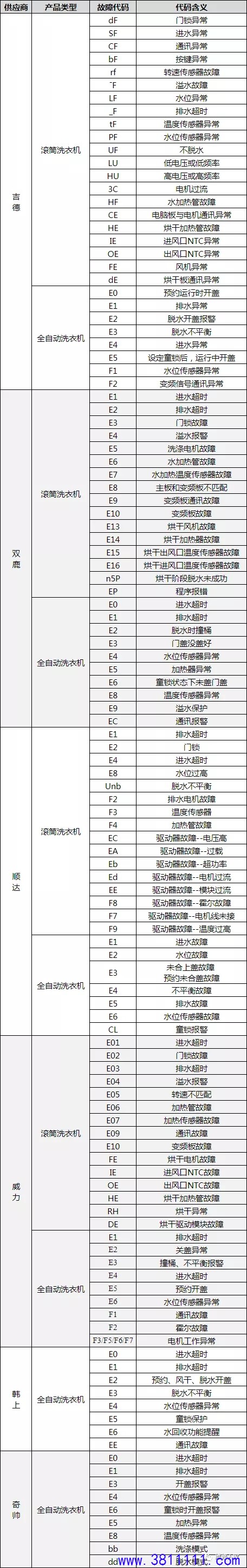 自主产品洗衣机故障代码汇总: