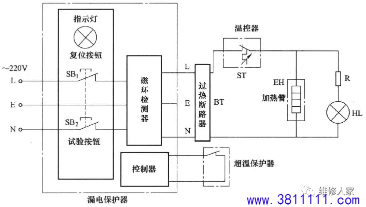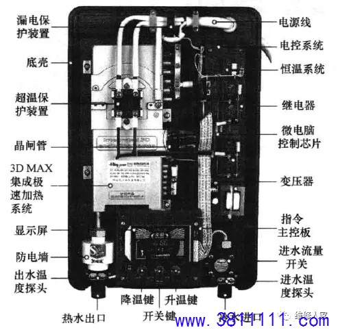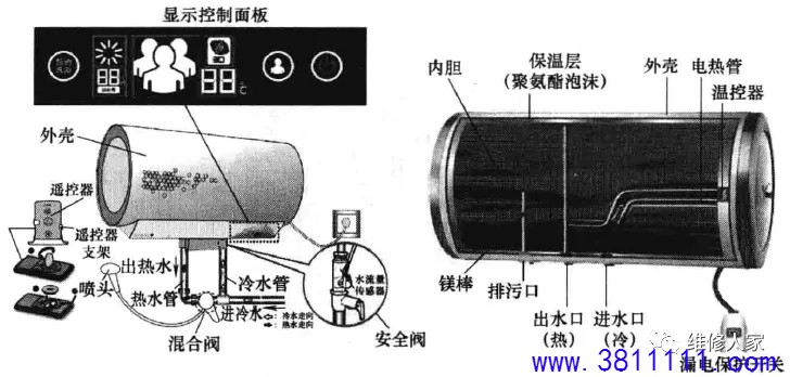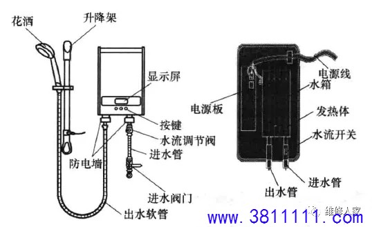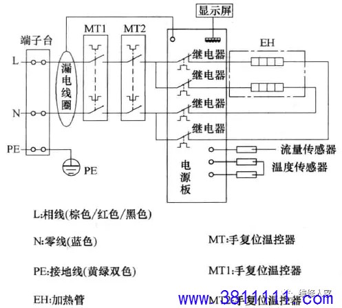 —、贮水式电热水器结构组成 贮水式电热水器是指具有一定储水容量的电热水器, 前将热水器内的水加热到设定的温度。 贮水式电热水器由外壳、内胆(贮水箱)、保温层、 及保护装置(如镁棒、温控器等)、安全阀(泄压阀)、 冷水管)、显示控制面板、喷头等组成,如下图所示。 外部结构:由外壳、端盖、控制盒(含旋钮或按钮、指示灯、显示控制面板等)、 连接管路(热水管、冷水管)、漏电保护开关(含电源线)等组成。 内部结构:由外壳、保温层、内胆、温控器、电热管、镁棒、电路板等组成。 贮水式电热水器按其出口型式可分为封闭式电热水器和敞开式电热水器两种: 封闭式电热水器在出水口处由一个或多个阀门控制水量,并在自来水压力下工作,该类热水器具有安装位置灵活、出水压力高及热损失小等优点,目前大多数厂家生产的贮水式电热水器都采用此种; 敞开式电热水器的出水口敞开,由进水管路上的一个阀门控制水量,此类热水器在常压下工作,故其内胆制作要求较低,且结构也相对简单; 按安装方式可分为壁挂卧式、壁挂立式和落地式三种; 按储水式容量可分为 30L、40L、50L、60L、80L、90L、100L 等。 二、贮水式电热水器的工作原理 贮水式电热水器的工作原理:利用发热器件加热内胆中的水,它是先在内胆贮满水,然后插上电源通电,把温度调到预定加热温度,通过发热管加热。当内胆水温达到预设温度时,温控器断开,自动停止加热转入保温状态;当水温下降到某一温度时,又 自动接通电源进行加热。 电气原理如下图所示:先将热水器内胆注满水,220V/50HZ交流电经过热断路器BT、温控器ST,施加到加热管EH上,指示灯亮进行加热,待内胆中水温上升到预设温度时,ST断路,停止加热,指示灯熄灭,待内筒中水温下降至某一温度时,ST再次接通,EH通电继续加热,指示灯亮,周而复始,达到自动控温、恒温。 三、即热式电热水器结构组成 即热式电热水器也称作快热式电热水器、即开即热电热水器或直热式电热水器,是一种可以通过电子加热器件来快速加热流水,并且能通过电路控制水温、流速和功率等,使水温达到适合人体洗浴的温度的热水器。它的优点是即开即热,无须等待,能在较短时间内将水温升高。目前市面上即热式电热水器比较混乱,没有统一标准,主要是由外壳、加热系统、启动装置、恒温系统、电路控制系统、超温保护系统、漏电保护系统和进出水管等组成。其外部与内部结构如下图所示。 四、即热式电热水器的工作原理 即热式电热水器是一种利用电能来加热的热水器,里面主要发热的是一种导热性比较强的加热体,通过电力转化为热能,热能再把热量传递到水里,在高功率的状态下, 短短几秒钟,强大的热量可以让进来的水的温度迅速上升。 工作过程是:当热水器正常通水时,电控电路中的水流或水压传感器(流量传感器)便检测到热水器已通水,此时,按下加热开关键或启动加热开关,控制电路则接通继电器或晶闸管,启动加热器加热,从而将水路中流动的水迅速加热供给用户使用。 下图所示为即热式电热水器电气原理图[以海尔3D256H-J1 (E)型为例]。 |